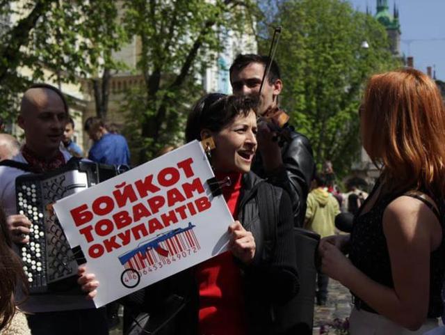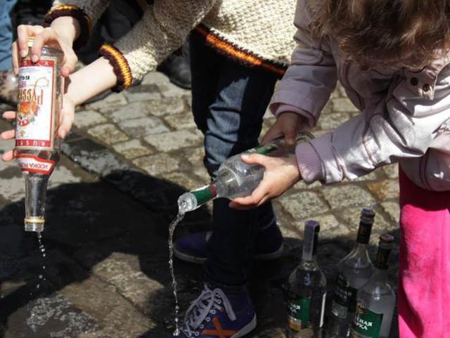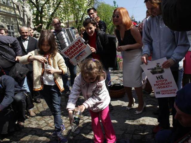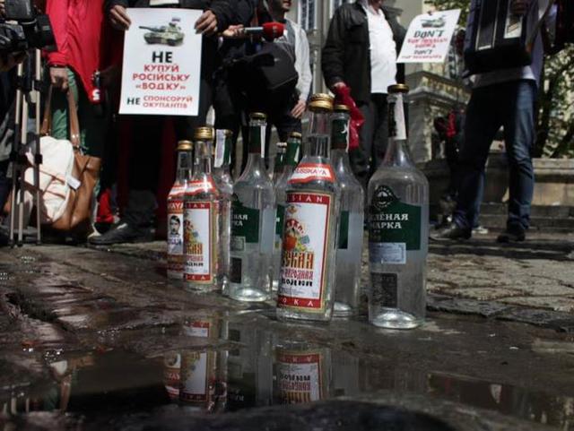 21 апреля во Львове на площади Рынок прошел флешмоб, участники которого вылили в канализацию десять бутылок русской водки. При этом они держали плакаты с призывами не покупать русскую водку и не поддерживать таким образом оккупантов - украинском и английском языках.