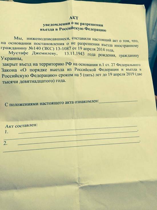 «Рано утром, 22 апреля 2014 года, лидер крымскотатарского народа, народный депутат Украины Мустафа Джемилев совместно с заместителем главы Меджлиса Асланом Омер Кырымлы выехали из Крыма в Киев. При пересечении административно-территориальной границы Крыма с Украиной, Мустафе Джемилеву вручили «Акт уведомления о не разрешении въезда в Российскую Федерацию», - написала она.