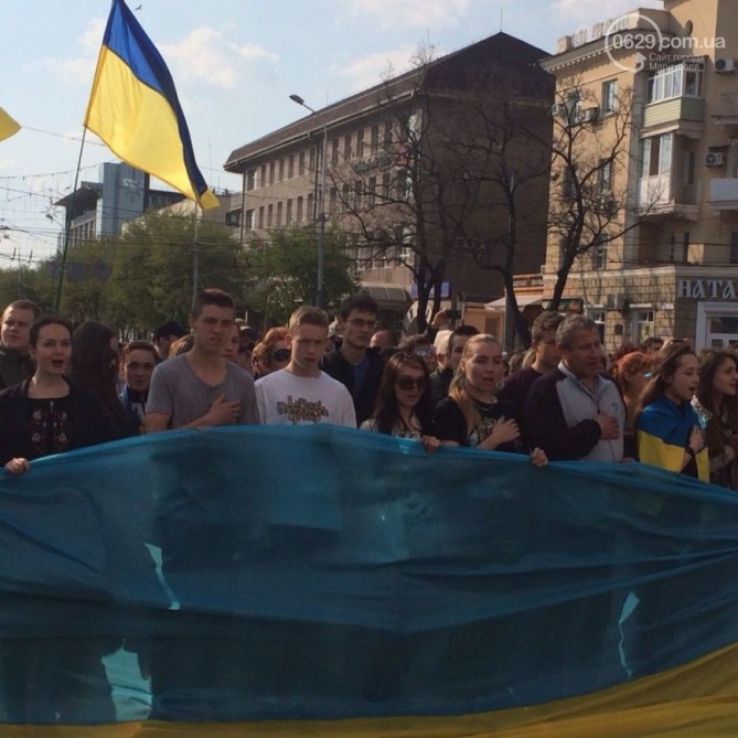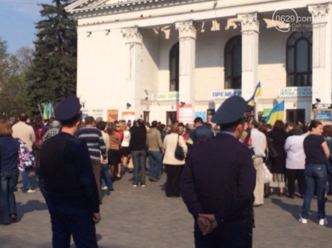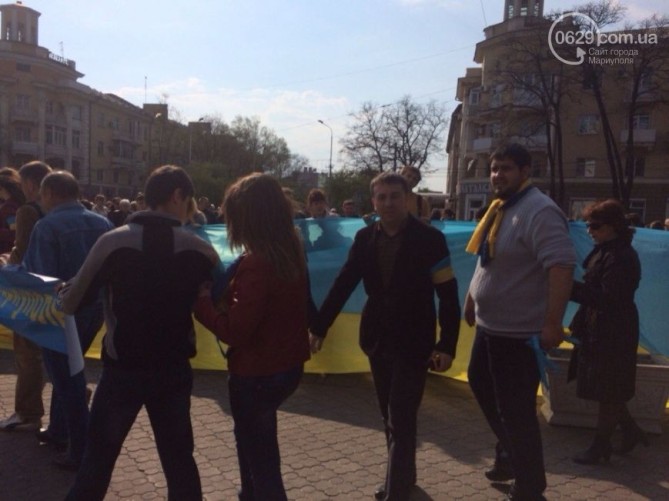 В Мариуполе в 16:00 возле драматического театра начался митинг за единую Украину. Здесь собрались около 1000 человек. Люди разного возраста держат в руках огромный флаг Украины (100мХ3м).