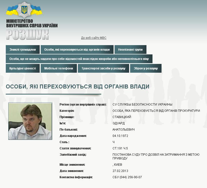 Служба безопасности Украины объявила в розыск экс-министра энергетики и угольной промышленности Украины Эдуарда Ставицкого. Соответствующая информация опубликована в списке разыскиваемых лиц на сайте Министерства внутренних дел Украины.