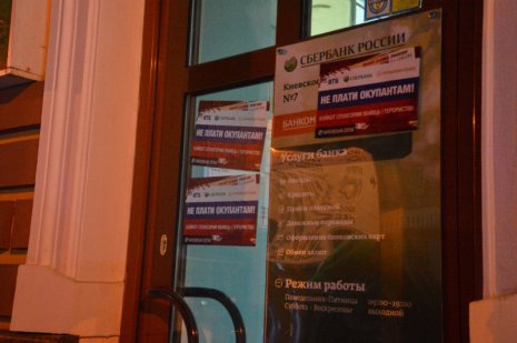 Активисты призвали бойкотировать российские государственные банки, поскольку подозревают их в финансировании терроризма и сепаратистских движений на Юго-Востоке Украины.