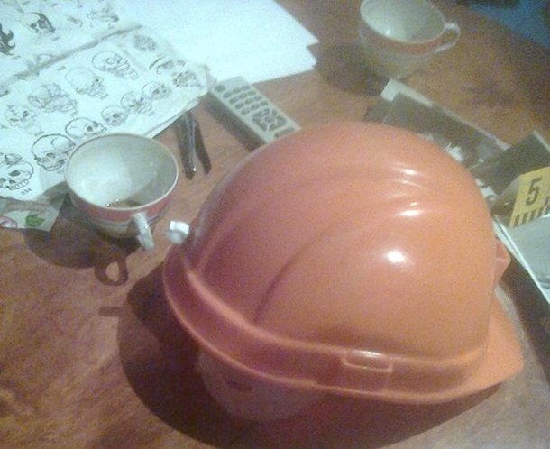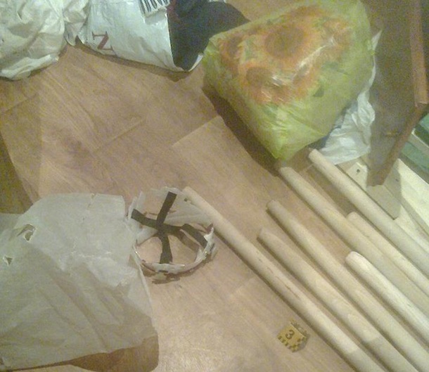 "Из квартиры были изъяты каски, подшлемники, патроны разного калибра, биты. Под опись работников милиции по каким-то причинам не попали и остались в помещении камуфляжная форма с нашивками УВБ, полиэтиленовые дождевики, спальные мешки, а также баклажка приспособленная для употребления конопли с колпачки из фольги, с характерными следами эксплуатации наркоманами", - говорится в сообщении.