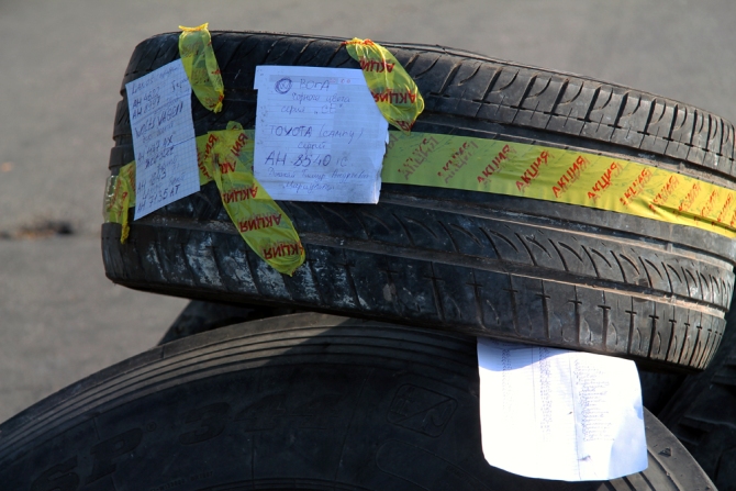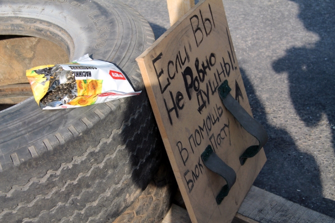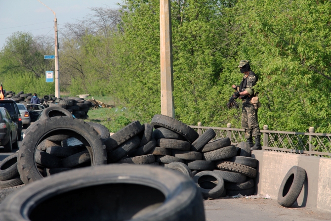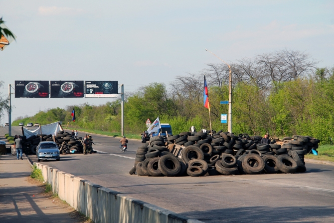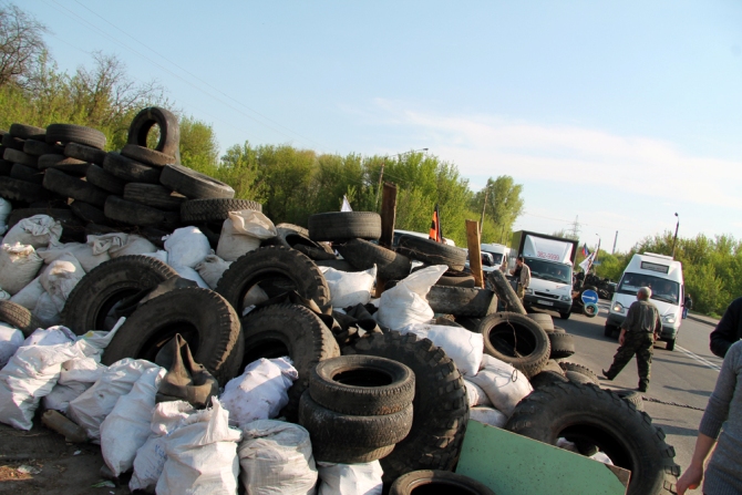 Въезд в Славянск со стороны Краматорска перегорожен баррикадами из покрышек, мешков с песком, между шин стоят заготовленные «коктейли Молотова», вывешены списки с номерами машин.
