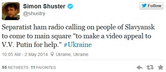 Сепаратисты в Славянске зовут жителей города прийти на главную площадь, чтобы сделать видеообращение к президенту РФ Владимиру Путину с просьбой о "помощи". Об этом сообщил журналист Саймон Шустер в своем Twitter'е.