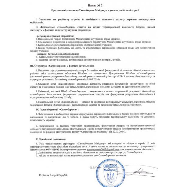 Также Самооборона создаст резервные батальоны территориальной обороны и откроет центры набора и подготовки добровольцев. Управление резервными батальонами будет происходить по административному принципу.