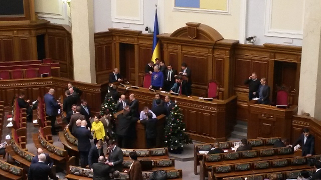 Народные депутаты от оппозиции заблокировали трибуну и президиум Верховной Рады. Место спикера Владимира Рыбака занимает представитель фракции «Батькивщина» Лидия Котеляк.