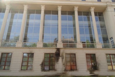 В здании выбиты стекла, видны осколки бутылок с зажигательной смесью. Офис пытались поджечь. Жертв нет, сообщает 0629