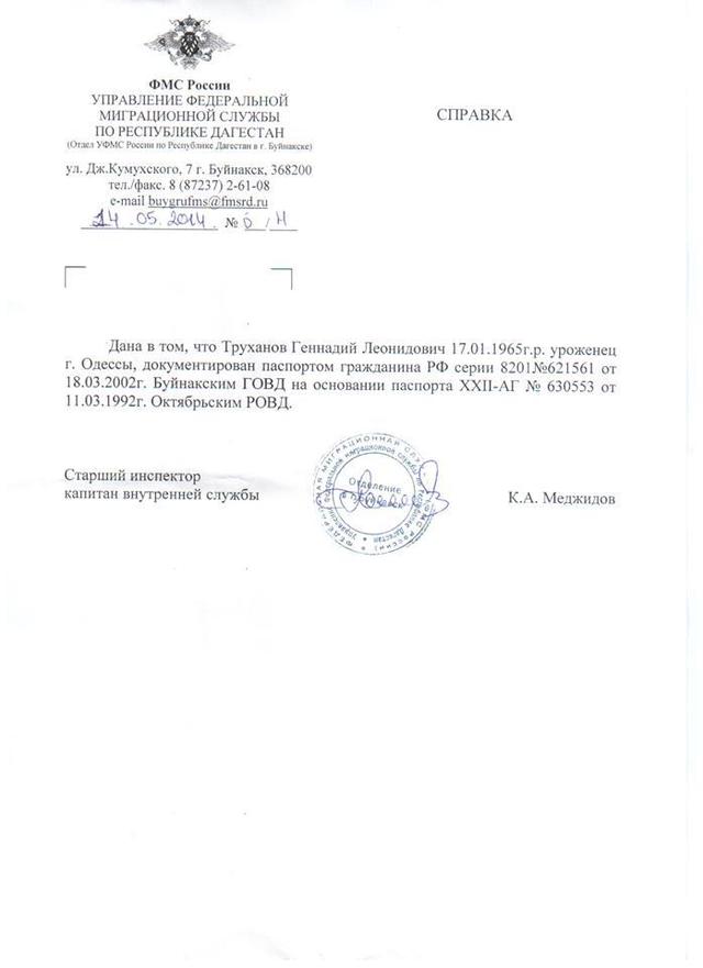 Так, по данным Федеральной миграционной службы РФ, уроженец города Одессы, Труханов Геннадий Леонидович, 1965 г. рождения является владельцем паспорта гражданина РФ с пропиской в г. Буйнакск (Республика Дагестан).