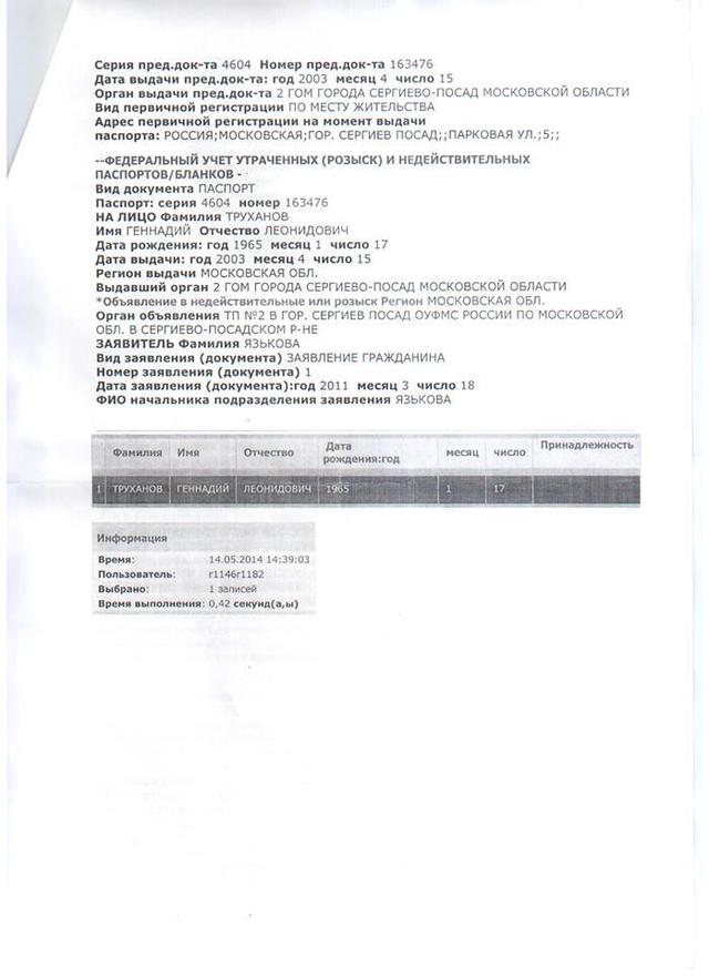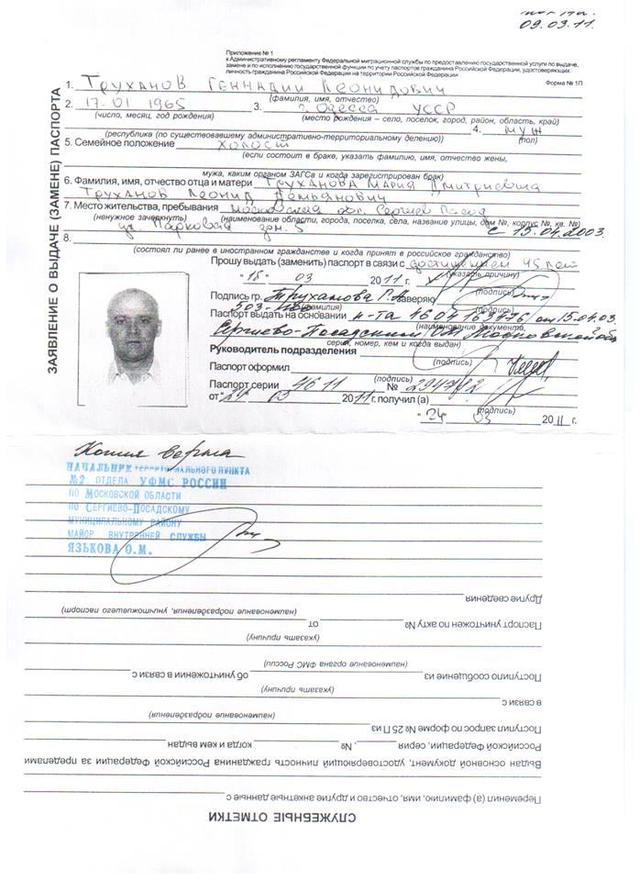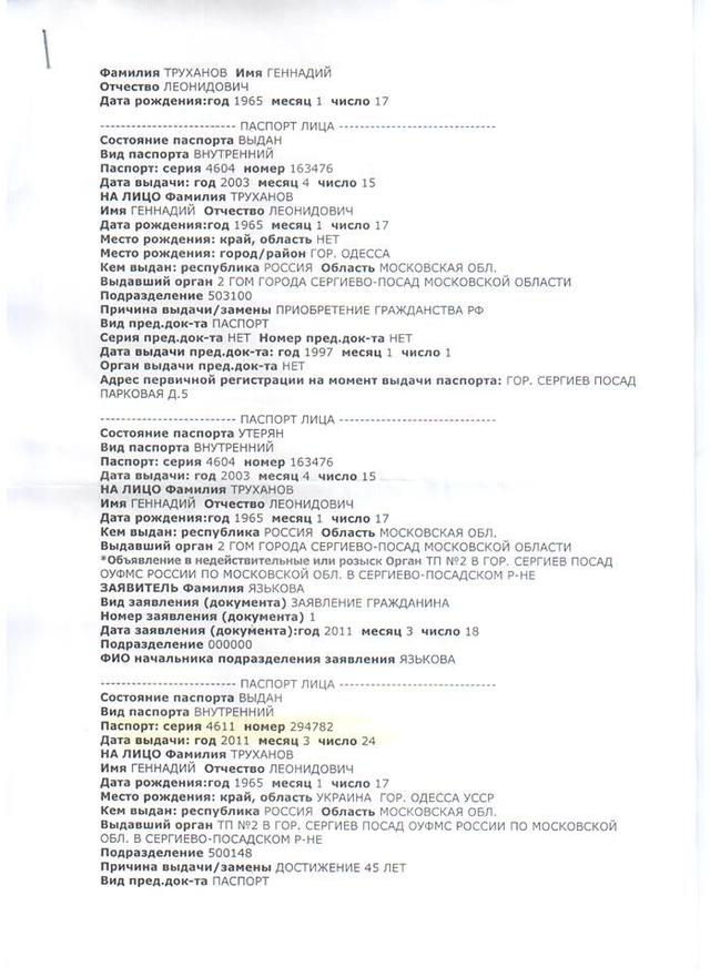 Имеющиеся официальные данные свидетельствуют и о том, что Труханов имеет и второй действительный паспорт гражданина РФ с пропиской в г. Сергиев-Посад (Московская область), выданный в связи с достижением 45 лет 24 марта 2011 года.