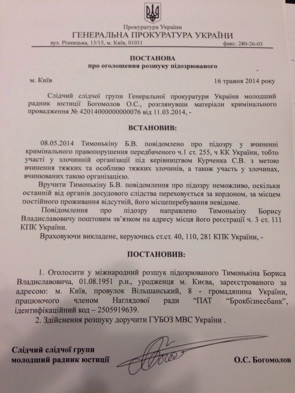 Генеральная прокуратура Украины 16 мая 2014 года объявила в международный розыск экс-председателя правления УкрсоцБанка UniCredit Бориса Тимонькина. В данный момент Тимонькин совмещает должность зампреда набсовета ПАО Укрсоцбанк UniCredit и замглавы набсовета корпорации ВЕТЭК одиозного Сергея Курченко.