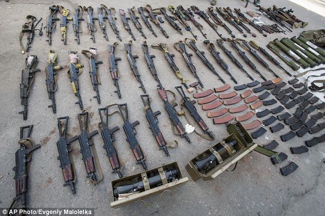 «Оружие, которое вы здесь видите, забранное в убитых, это трофеи», - сказал журналистам человек в балаклаве, который назвался «Бесом».