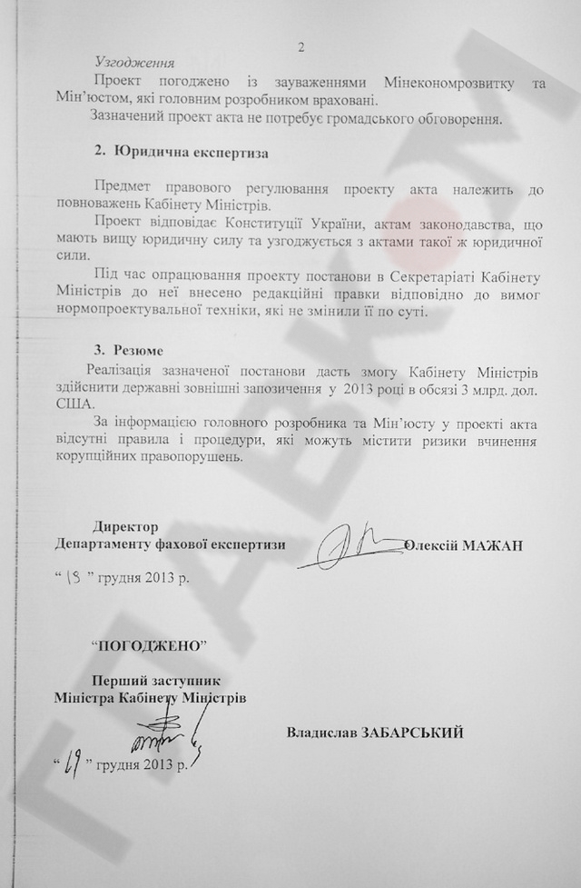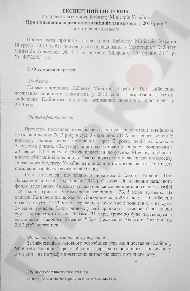 В заключении правительственных экспертов шла речь о том, что в бюджете на 2013 год предельная сумма финансирования Госбюджета за счет заимствований была установлена в размере 129,4 млрд грн, в том числе внешних заимствований – 36,5 млрд. На момент подписания Азаровым постановления о получении транша российского кредита Кабмин уже осуществил заимствований на 117,3 млрд грн, в том числе внешних, – 24 млрд грн.