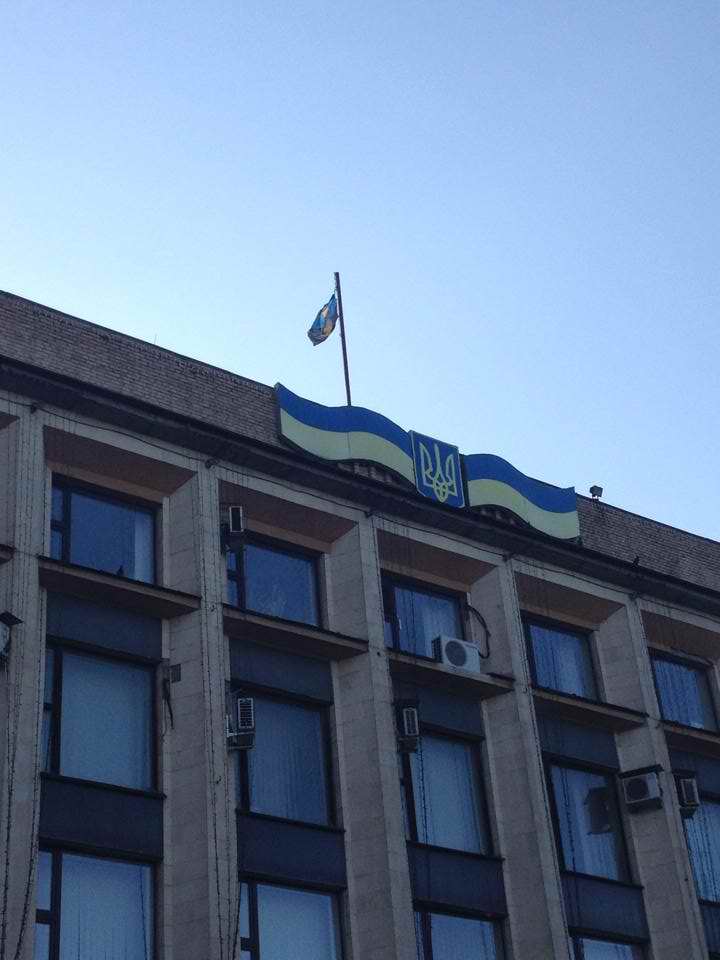 На здании Донецкого городского совета спущен украинский флаг. Сейчас на здании развевается флаг города Донецка. Долгое время городской совет оставался одним из последних административных зданий, работавшим под украинским флагом.