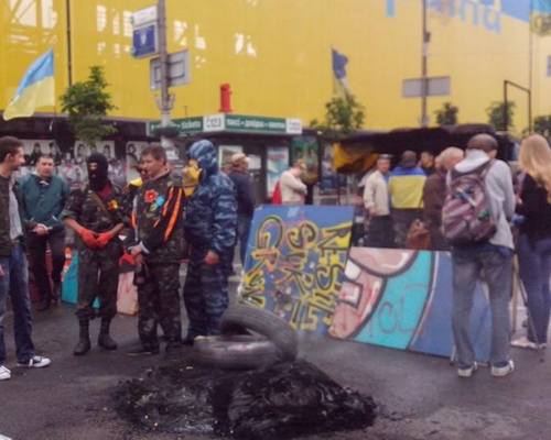 Сегодня утром около 30 человек в камуфляже заявили, что не хотят «зачистки» Майдана и подожгли несколько шин якобы в знак протеста против сноса палаток на Майдане. Кроме того, они вступали в перепалки с прохожими, которые возмущались происходящим.
