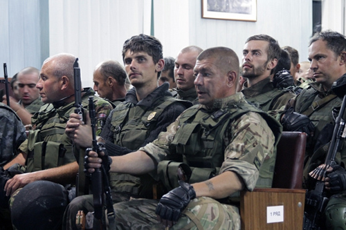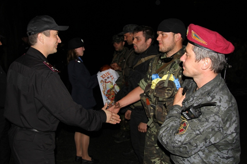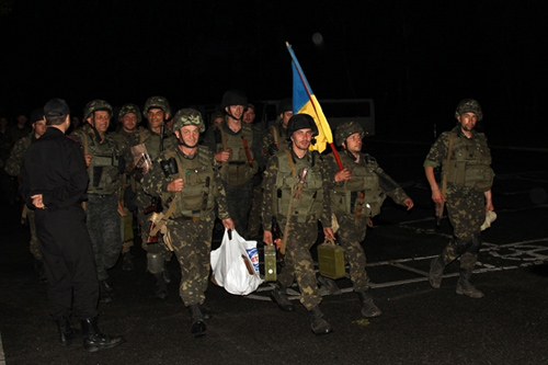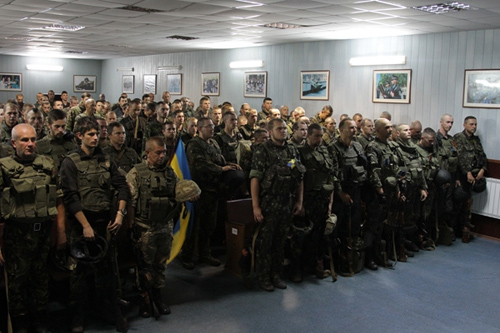 На полигоне под Киевом накануне торжественно встречали 1 резервный батальон Национальной гвардии Украины, вернувшийся с востока после антитеррористической операции, а в воскресенье гвардейцы почтили память своего павшего под Славянском боевого товарища.