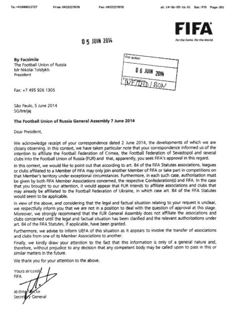 «Ваше письмо проинформировало нас о намерении аффилировать Федерацию футбола Крыма, Федерацию футбола Севастополя и несколько клубов в Российский футбольный союз (РФС) и что Вы, очевидно, просите одобрения ФИФА в этой связи», - говорится в письме, которое подписано генсеком ФИФА Жеромом Вальке.