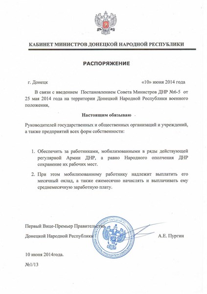 Правительство самопровозглашенной «Донецкой народной республики» (ДНР) обязывает руководителей предприятий выплачивать зарплату сотрудникам, мобилизованным в ряды ополченцев и принимающих участие в боевых действиях. Об этом идет речь в распоряжении кабинета министров ДНР от 10 июня 2014 года, сообщает издание Gorlovka.ua..