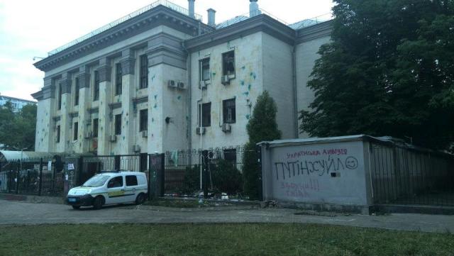 Участники акции начали забрасывать здание взрывными пакетами. Протестующие громили автомобили дипломатов и забрасывали здание посольства яйцами, частями автомобилей и камнями. Уже разбито несколько окон.