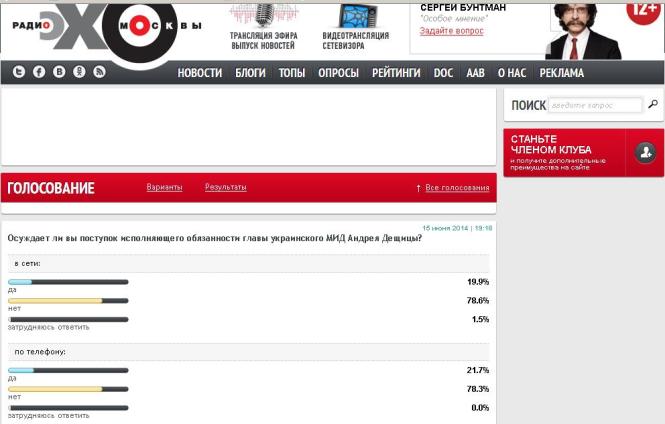 «ЭХО Москвы» предложило ответить на вопрос: «Осуждаете ли вы поступок исполняющего обязанности главы украинского МИД Андрея Дещицы?». Утвердительно ответили на него в сети 19,9% пользователей, по телефону – 21,7%. Не осуждают поступок Дещицы 78,6% и 78,3% соответственно. Затруднились ответить 1,5%.