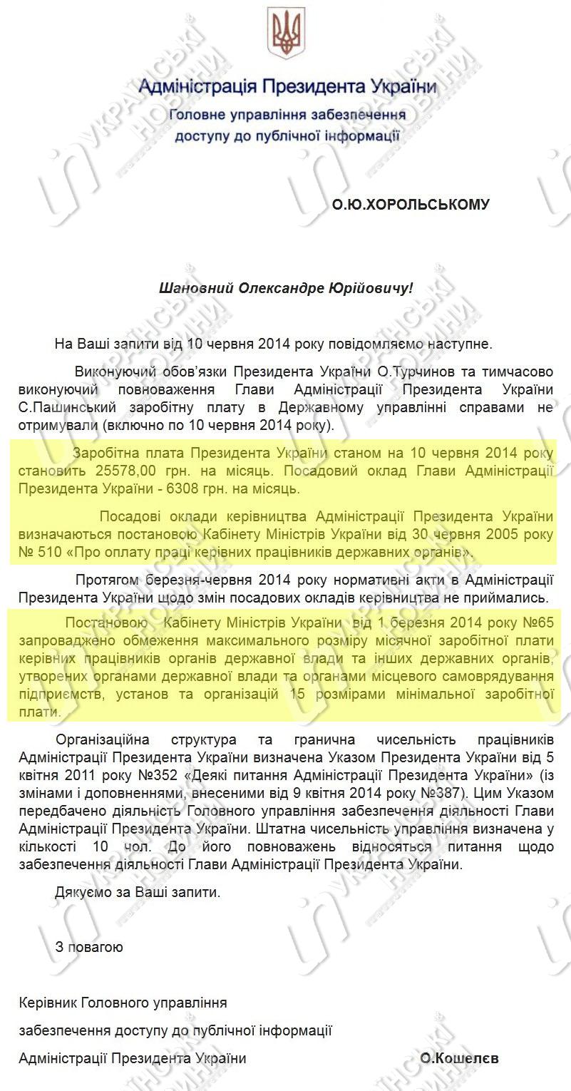 По сообщению АП, зарплата президента со времен Януковича не менялась, и по состоянию на начало июня 2014 года она составляет 25 578 гривен в месяц. В то же время в АП планируют руководствоваться постановлением КМУ от 1 марта 2014 года, которое ограничивает максимальный размер зарплаты чиновников сумму в «15 размеров минимальной заработной платы». Согласно закону о госбюджете, минимальная заработная плата в 2014 году составляет 1218 гривен и на протяжении года меняться не будет.