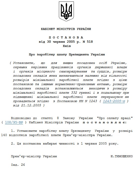 На самом деле, президент Украины является одним из немногих чиновников, кто не имеет должностного оклада. Его «зарплата» исчисляется размером в 140% от «зарплаты премьер-министра», согласно постановлению 2005 года за подписью Юлии Тимошенко, которое длительное время находилось под грифом секретности.