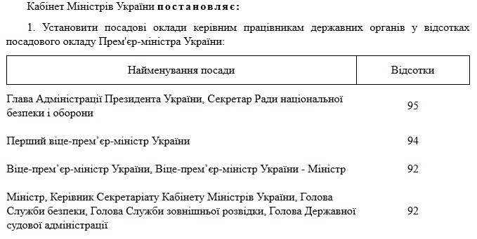 Зарплаты остальным чиновникам состоят из окладов, которые высчитываются в процентах от «должностного оклада премьер-министра», а также различных надбавок согласно нормам постановления Кабмина от 2005 года «Об оплате труда руководящих сотрудников государственных органов».