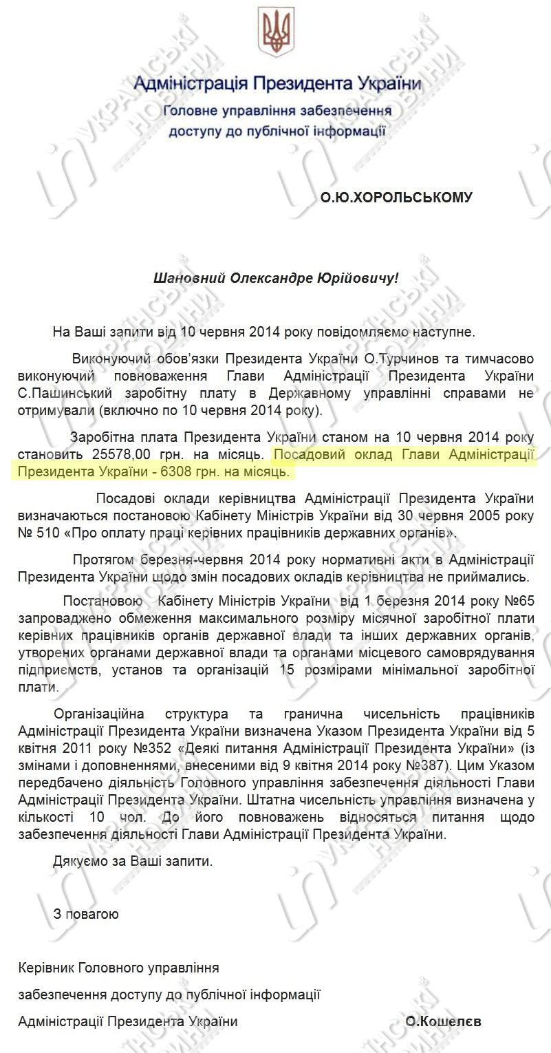 «Должностной оклад Главы Администрации Президента Украины - 6 308 грн в месяц», - говорится в ответе.