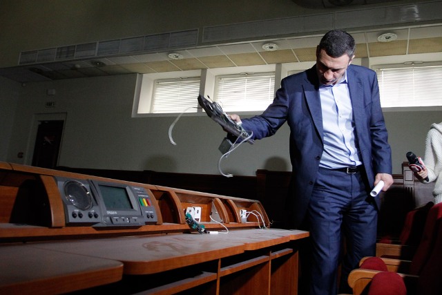Он отметил, что сейчас полностью уничтожена система для голосования в сессионном зале, поломанные стулья и столы в президиуме зала голосований, разрушена система коммуникации, вентиляции, кабельного обеспечения. «Посмотрите, есть даже отпечатки от выстрелов. Нам сказали, что в зале также взрывы гранат», - отметил Кличко.