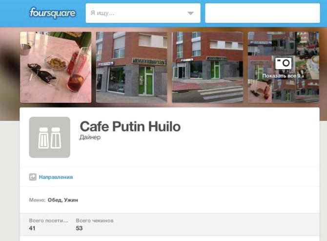 Украинцы в Испании переименовали в соцсети Forsquare кафе под названием «Путин» на «Путин х***ло». Об этом в Facebook написал украинский журналист Павел Кащук.