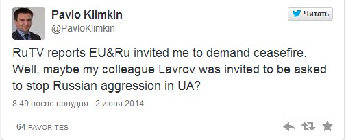 «Российское телевидение говорит, что ЕС и РФ вызвали меня, чтобы Украина возобновила прекращения огня. А может это коллегу Лаврова (главу МИД России, - Ред.) вызвали, чтобы РФ прекратила агрессию», - написал Климкин.