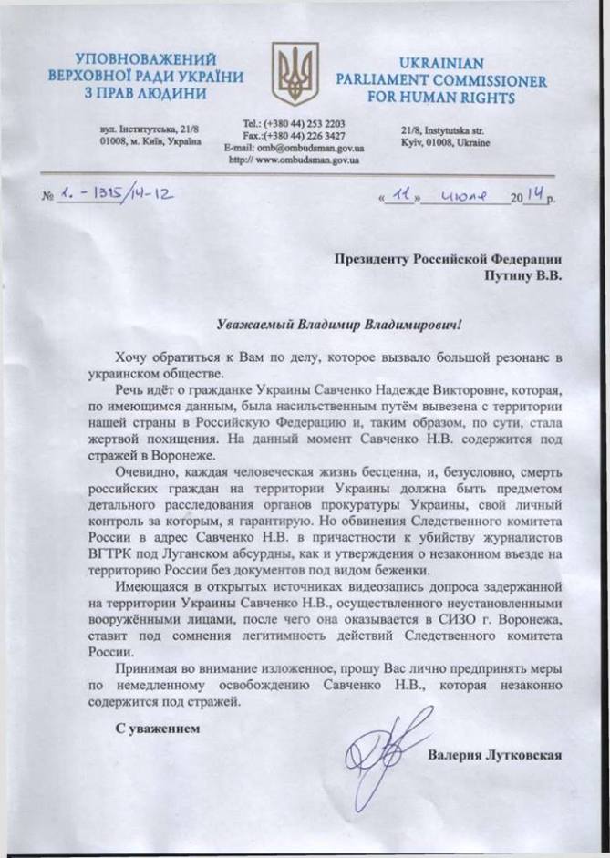 Валерия Лутковская обратилась к президенту Российской Федерации Владимиру Путину с требованием принять меры по немедленному освобождению гражданки Украины Надежды Савченко, которая на данный момент находится в Воронежском следственном изоляторе.