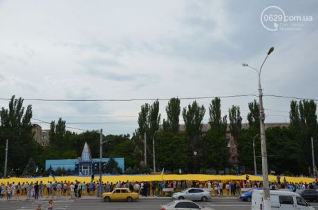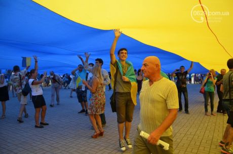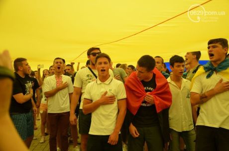 Когда огромный флаг был развернут, любопытные жители стали гулять под ним, фотографироваться и петь гимн Украины.