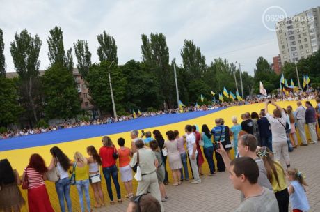 Развернули флаг на тысячном митинге, который был организован в честь месяца со дня освобождения Мариуполя от ДНР.