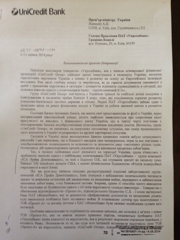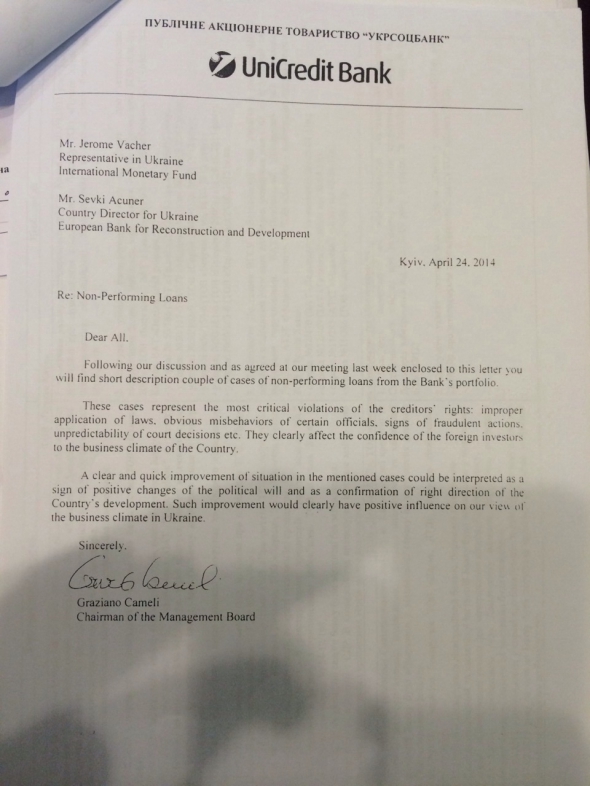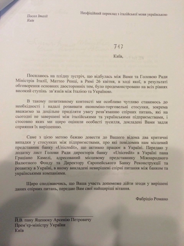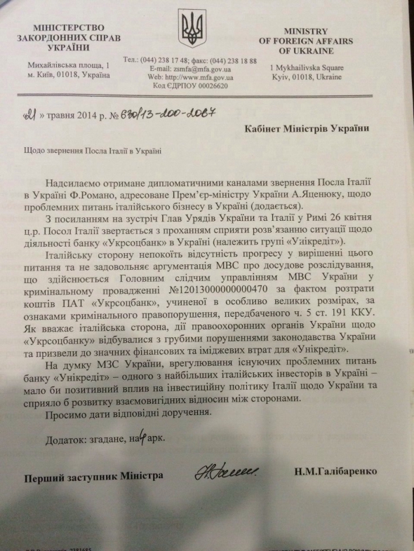 Из полученных изданием Gazeta.ua копий документов видно, что председатель правления UniCredit/УкрсоцБанк Грациано Камели, гражданин Италии, который заменил на этом посту ныне объявленного в розыск Бориса Тимонькина, требует от премьер-министра Украины Арсения Яценюка особого отношения к UniCredit/УкрсоцБанк. Слово в слово данные запросы дублирует представитель дипломатической миссии Италии в Украине Фабрицио Романо.