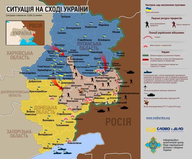 По состоянию на 12:00 22 июля ситуация на Донбассе выглядит таким образом: