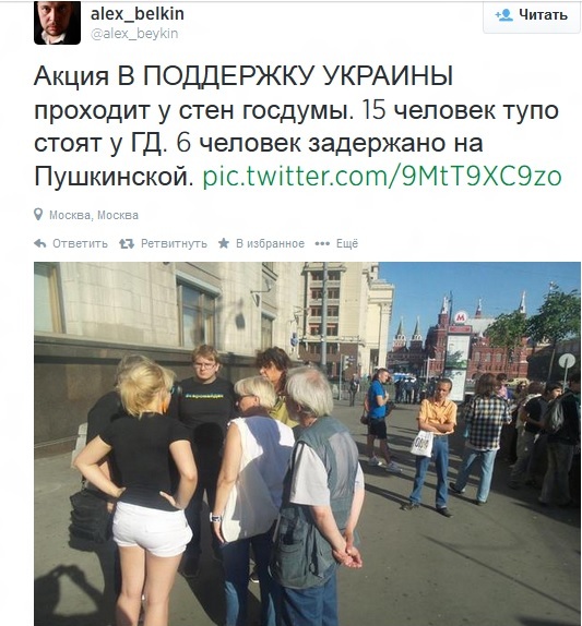 Как пишет фотограф Алексей Белкин, одновременно возле здания Госдумы на Тверской улице собрались 15 участников акции «в поддержку Украины».