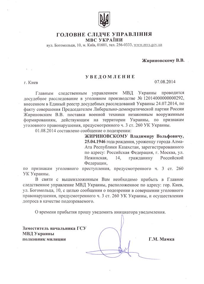 Министерство внутренних дел Украины официально вызвало на допрос в Киев депутата Госдумы России от ЛДПР Владимира Жириновского. Соответствующее постановление о вызове на допрос подписал в четверг, 7 августа, заместитель начальника Главного следственного управления МВД Григорий Мамка.