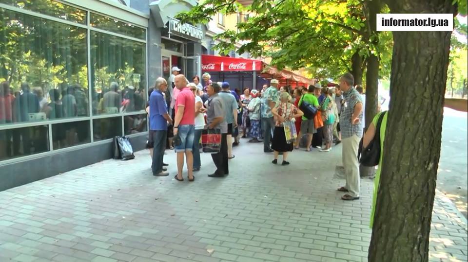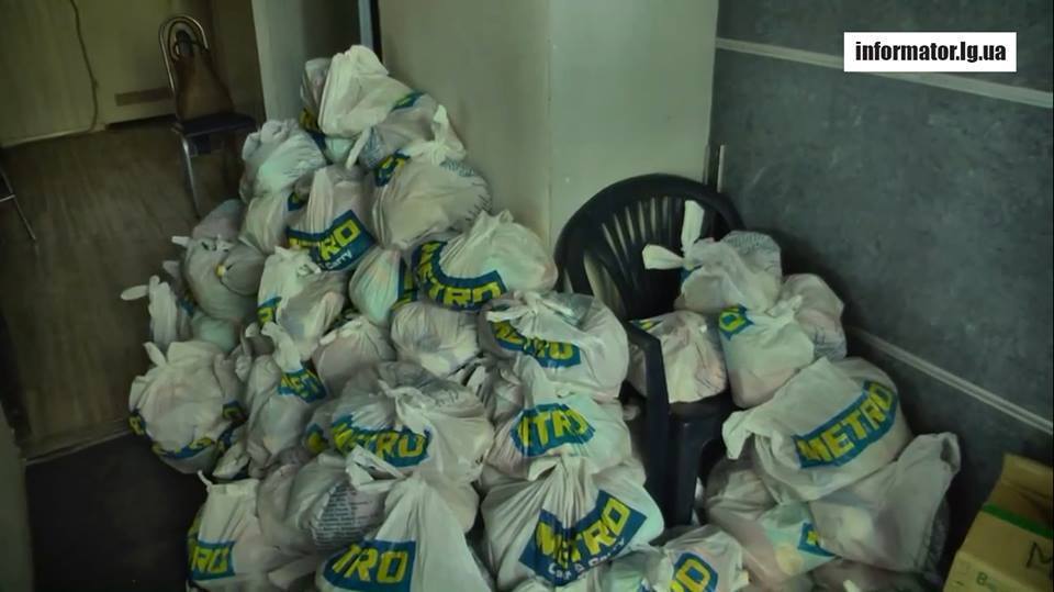 В центре Луганска в кафе «Снежинка» «ополченцы» ЛНР организовали пункт гуманитарной помощи. Под видом продуктов переданных из Российской Федерации для жителей Донбасса, раздают пакеты с продовольствием из недавно разграбленного супермаркета «METRO».