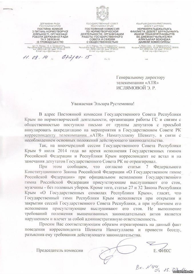 «В адрес постоянной комиссии поступило письмо от группы депутатов с просьбой аннулировать аккредитацию на мероприятия в Государственном совете АРК корреспонденту телекомпании «АТР» Наматуллаеву Шевкету, в связи с несоблюдением основных положений действующего законодательства. Так, на внеочередной сессии Госсовета Республики Крым 9 июля 2014 года, во время исполнения государственного гимна Российской Федерации и Республики Крым, корреспондент не встал, и на замечания депутатов Госсовета АРК не отреагировал. Просим вас соответствующим образом отреагировать на данный факт поведения корреспондента Шевкета Наматуллаева и провести беседу, разъяснив ему требования действующего законодательства», – говорится в письме.