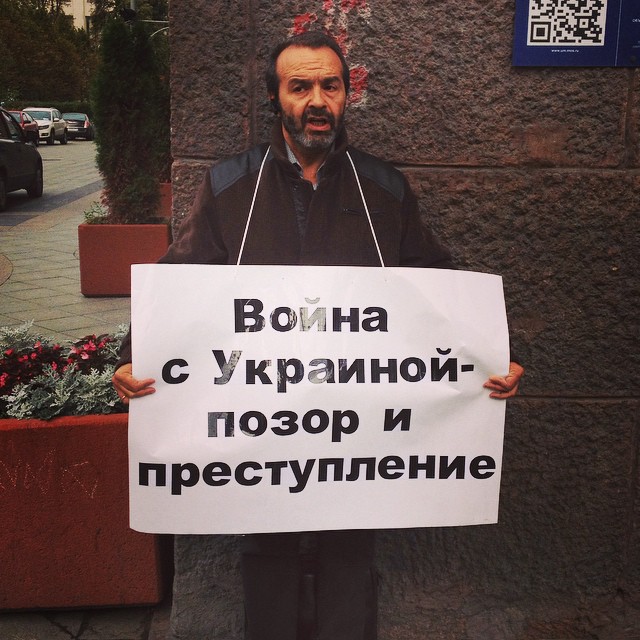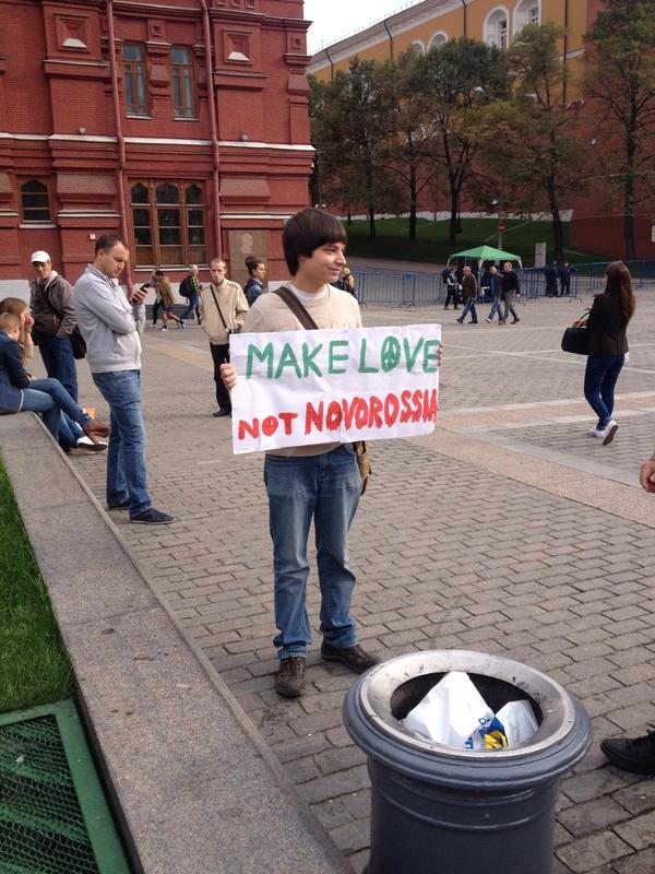 На одиночный пикет против войны с Украиной вышел также музыкант Вася Обломов, о чем он сообщил в своем твиттере. Около 17:30 Обломов стоял у здания Государственного исторического музея с плакатом «Make love not Novorossia».
