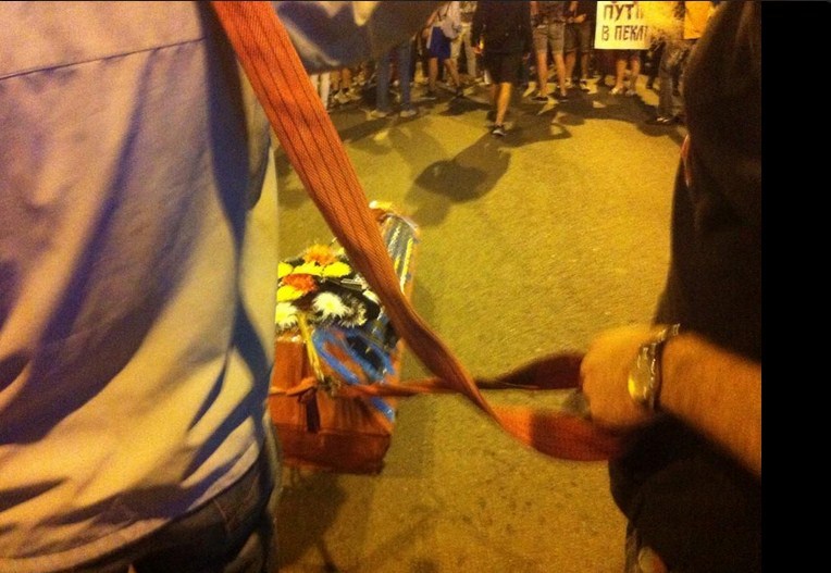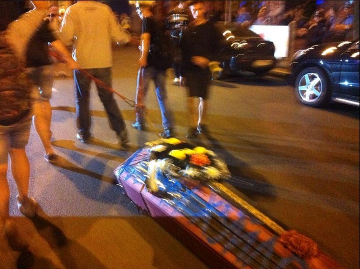 Под их бурные аплодисменты активисты забили «гроб с Путиным».