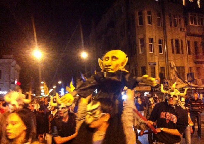 В Харькове к зданию консульства России активисты с украинской символикой и в масках чертей привезли «гроб с президентом РФ Владимиром Путиным».