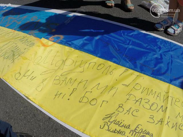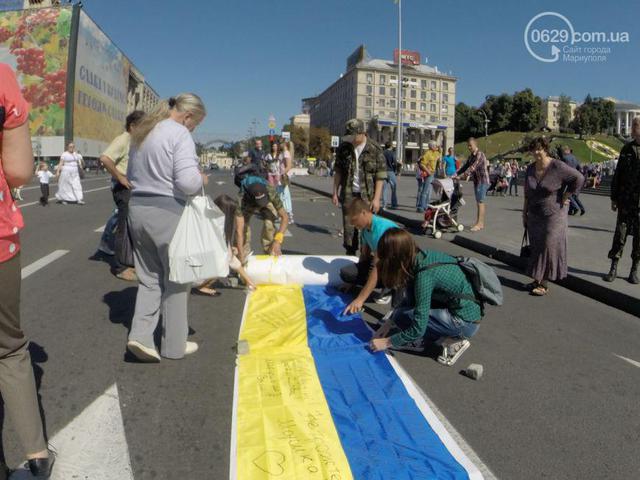 Гимн Украины, минута молчания... А затем из флагов выложили целую дорогу единения длинною в километр. Среди собравшихся было много мариупольцев, которые живут сейчас в столице, но переживают за родной город. Люди писали пожелания -»Не трожьте Марика!», «Мариуполь, мы с вами, мы за мир!», «Мариуполь- это Украина!»