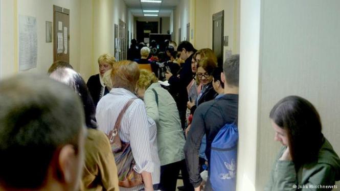 В УФМС России на улице Кирпичная в Восточном административном округе Москвы, где выдают свидетельства о предоставлении временного убежища и разрешения на временное пребывание, очередь надо занимать с вечера. Сейчас людей немного, утверждают беженцы: «Летом по три тысячи человек стояли на улице. Шел дождь - картонками накрывались».