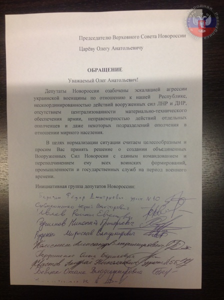 «Депутаты Новороссии озабочены эскалацией агрессии украинской военщины по отношению к нашей республике, нескоординированностью действий вооруженных сил ЛНР и ДНР, отсутствием централизованности материально-технического обеспечения армии, неправомерностью действий отдельных ополченцев и даже некоторых подразделений ополчения в отношении мирного населения», - говорится в обращении.