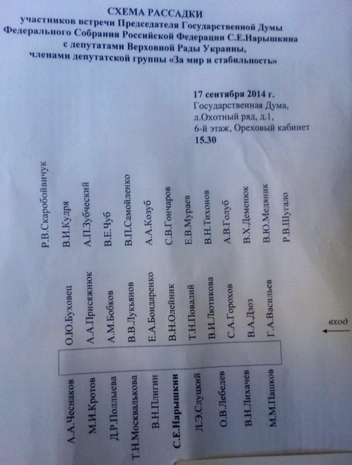 Список нардепов, который использовался в Госдуме для рассадки «гостей из Украины», выглядит следующим образом: