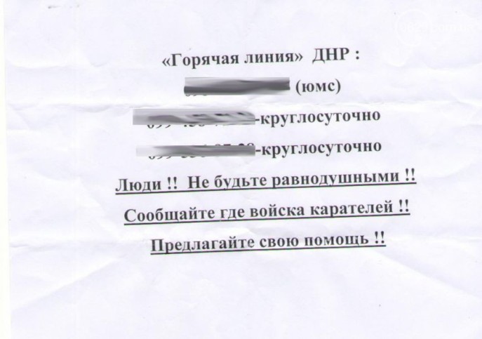На листовке сообщался «горячий телефон» террористов. Звонить по нему нужно для того, чтобы сообщить места дислокации украинских военных или же оказать другую помощь «ДНР».