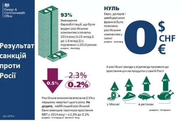 Представительство Европейского союза в Украине презентовало информационную таблицу, иллюстрирующую, как европейские санкции повлияли на экономику России.