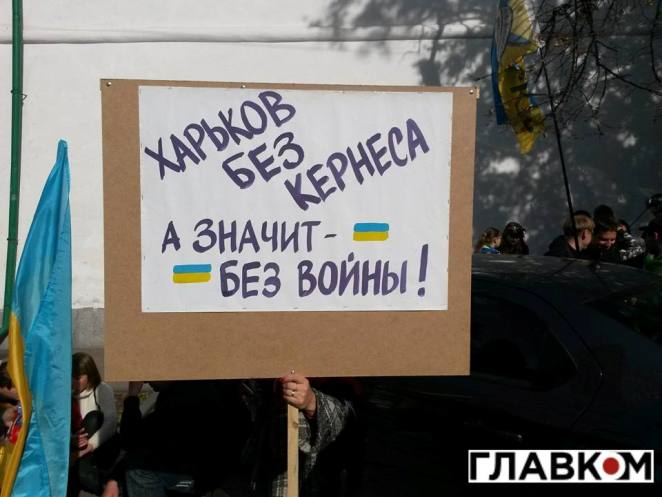 Один из множества плакатов, которые держат харьковчане, гласит: «Харьков без Кернеса, а значит – без войны!».