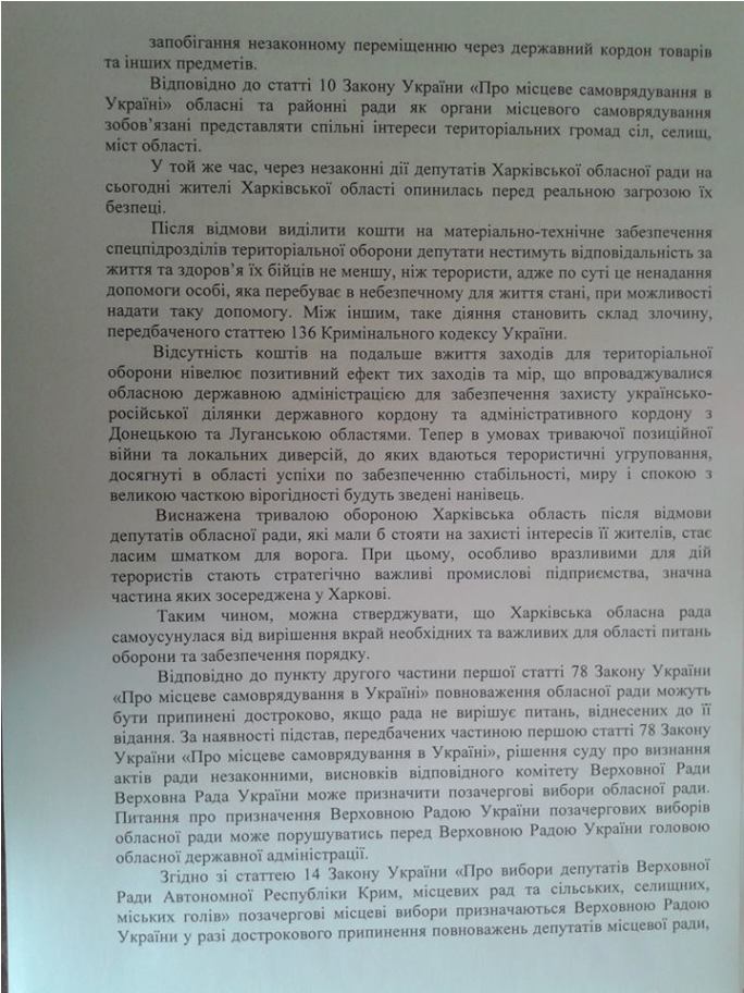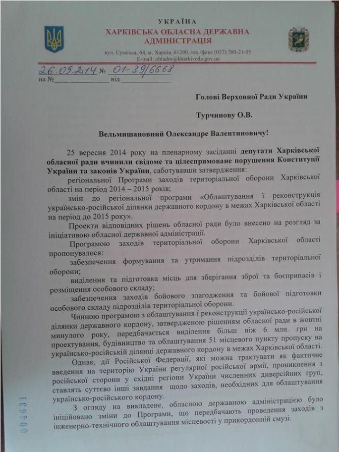 Глава Харьковщины просит Турчинова распустить облсовет «за саботаж» (ДОКУМЕНТ)